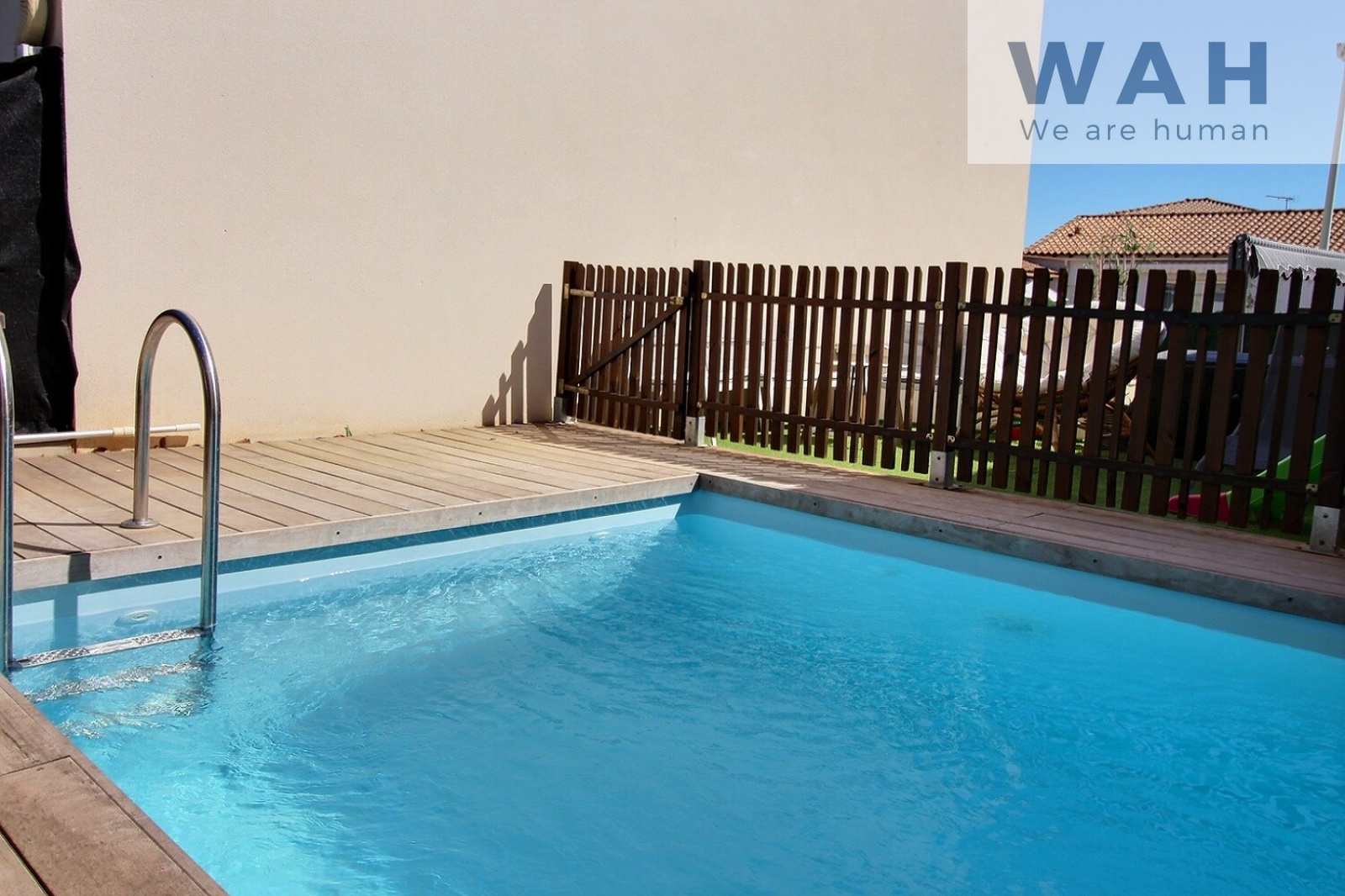 La maison est édifiée sur un terrain de 228 m² joliment aménagé avec piscine sur mesure 3x3, 2 terrasses (une de chaque côté) et un jardin.