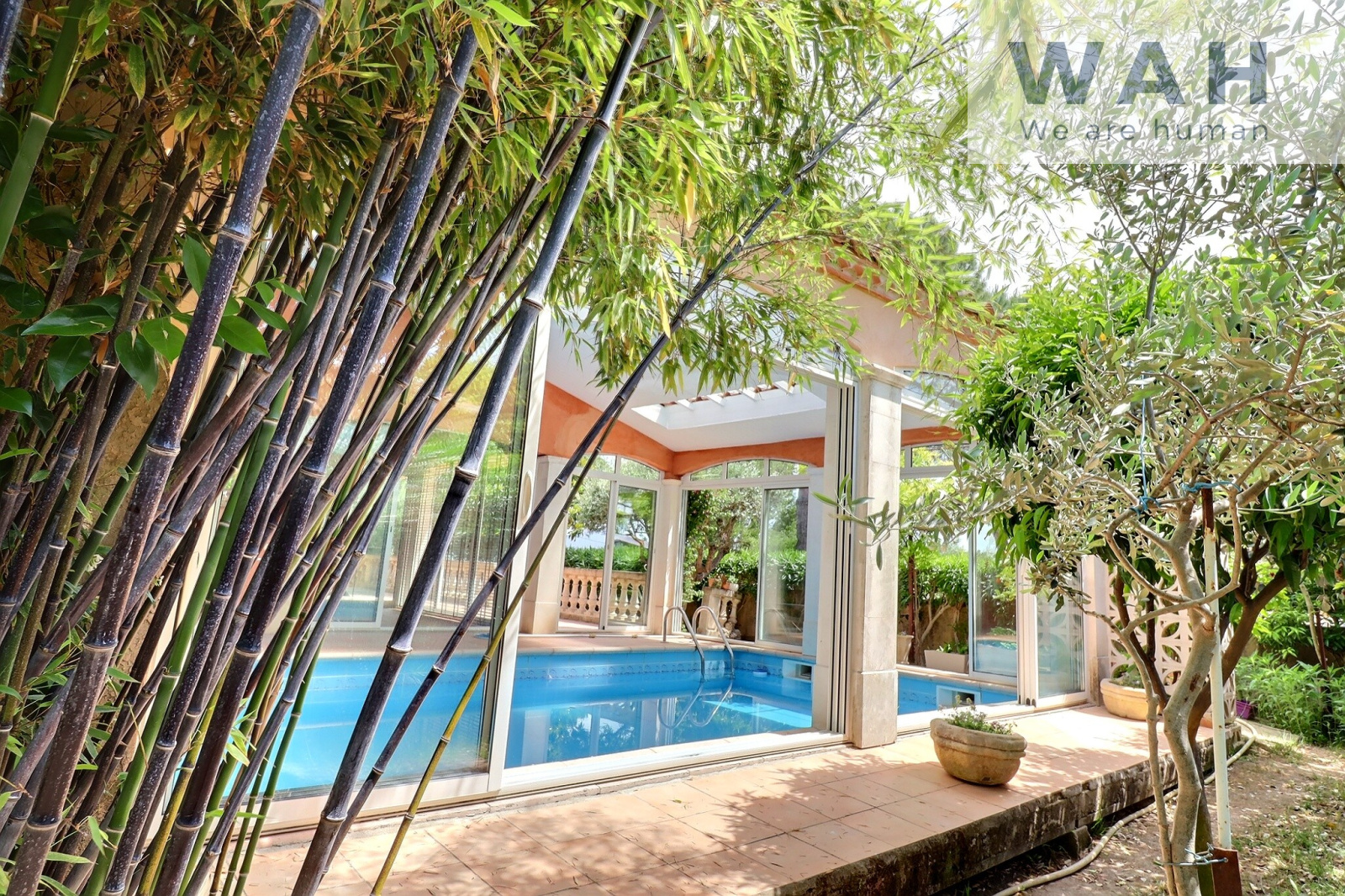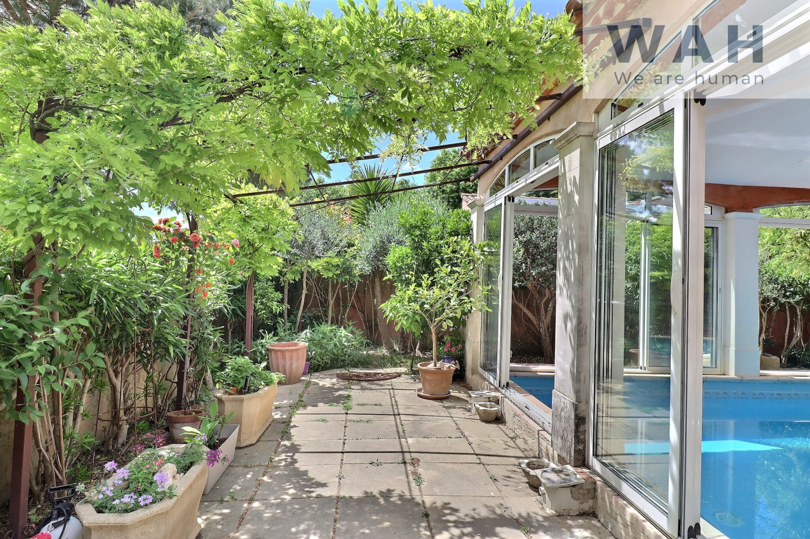 Côté extérieur, vous pourrez bénéficier d'un jardin arboré sans vis-à-vis, d'un très bel espace couvert de 60m² avec piscine et coin cuisine d'été, d'une terrasse de 40m² avec stores banne électriques