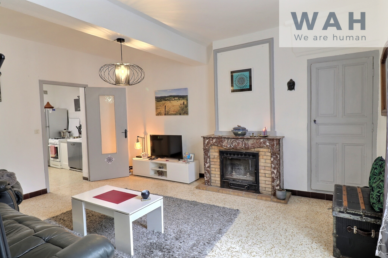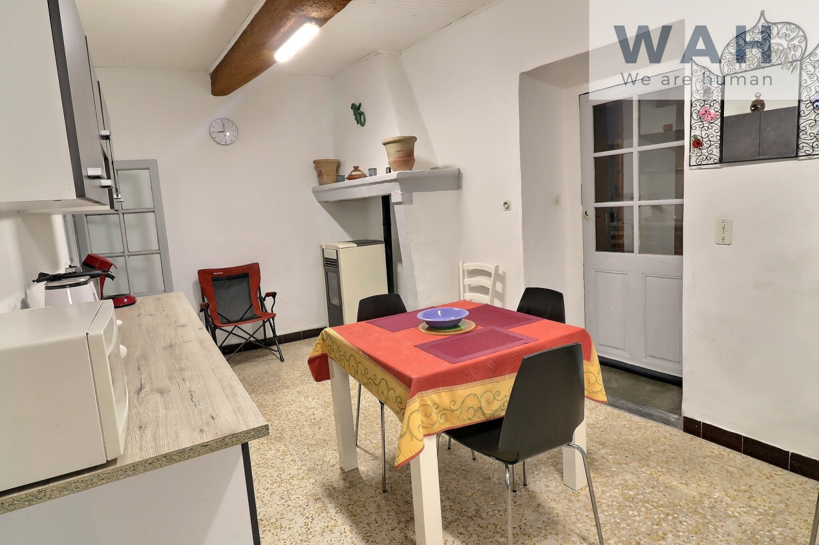 Cette maison se compose au rez de chaussée : une entrée, un salon avec cheminée, une cuisine séparée, une cours, une salle de bain, un WC.