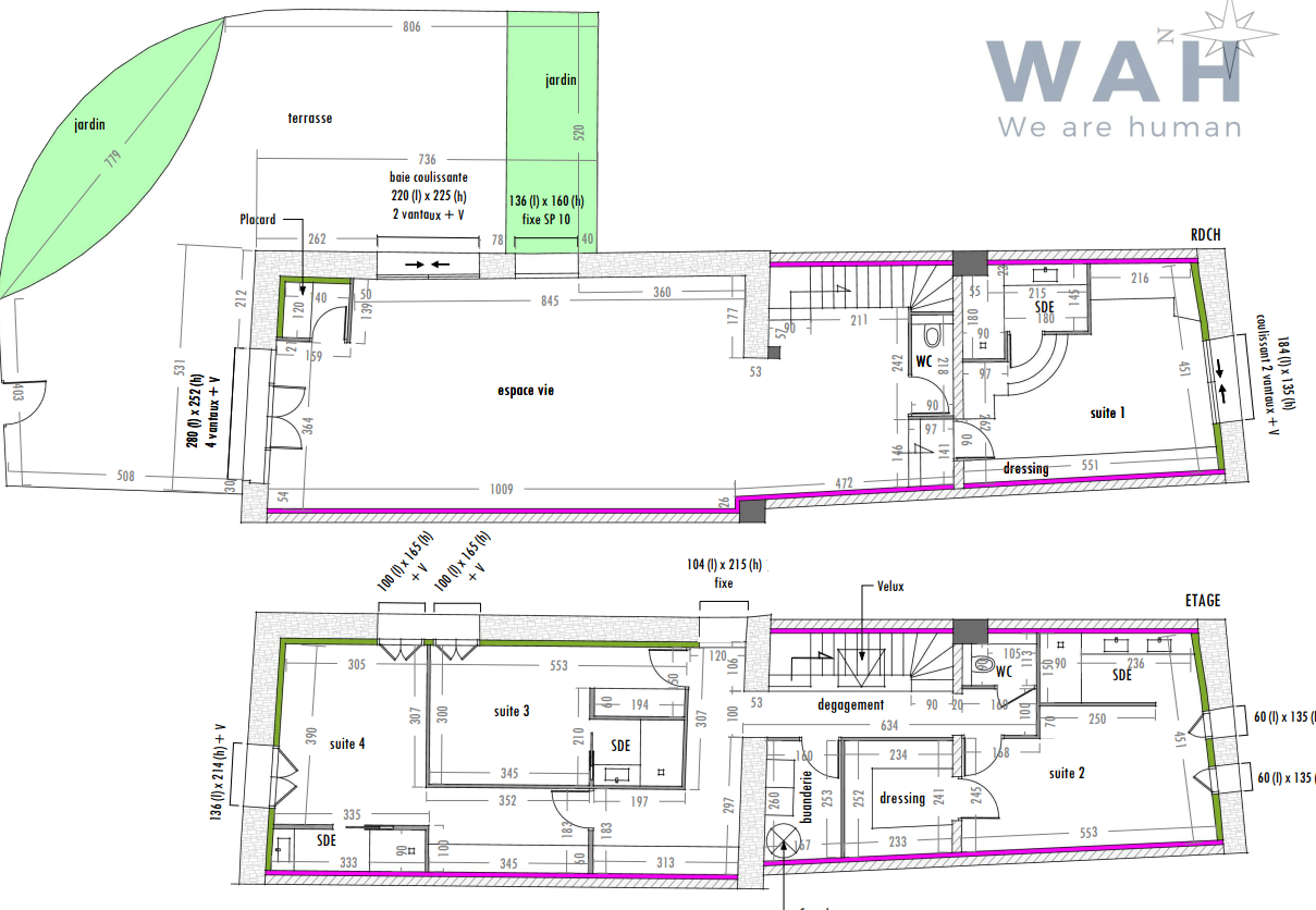 A vendre : Maison 5 pièces de 180 m² comprenant en rdc un espace de vie avec cuisine de 66,86 m², une suite avec salle d'eau et dressing et un wc.