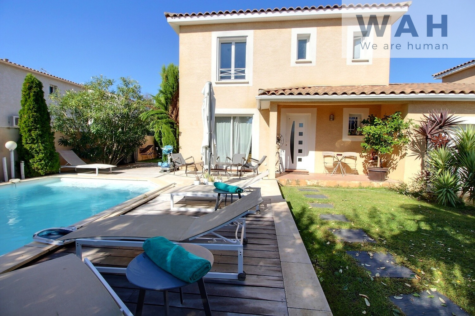 Cette maison mitoyenne par le garage est composée d'une cuisine ouverte sur une grande pièce de vie, un cellier et un wc. A l'étage se trouve 3 chambres, une salle de bain avec wc. Un grand garage fini l'ensemble. A l'extérieur vous profiterez d'une piscine chauffée.
