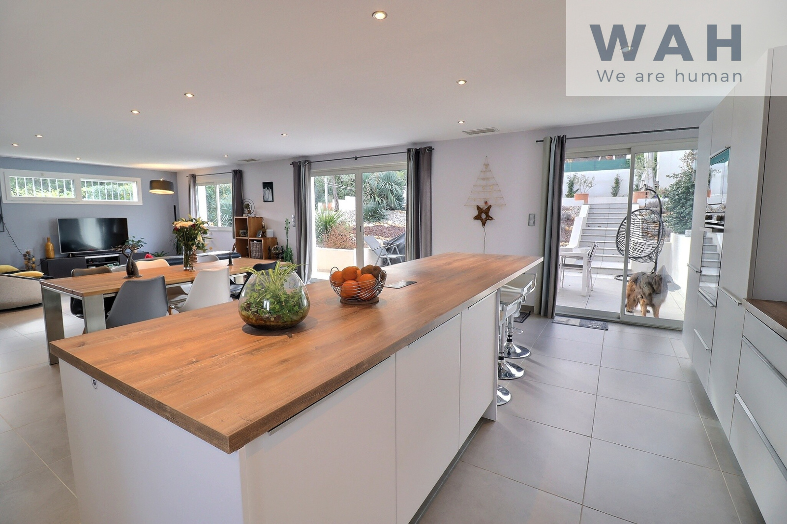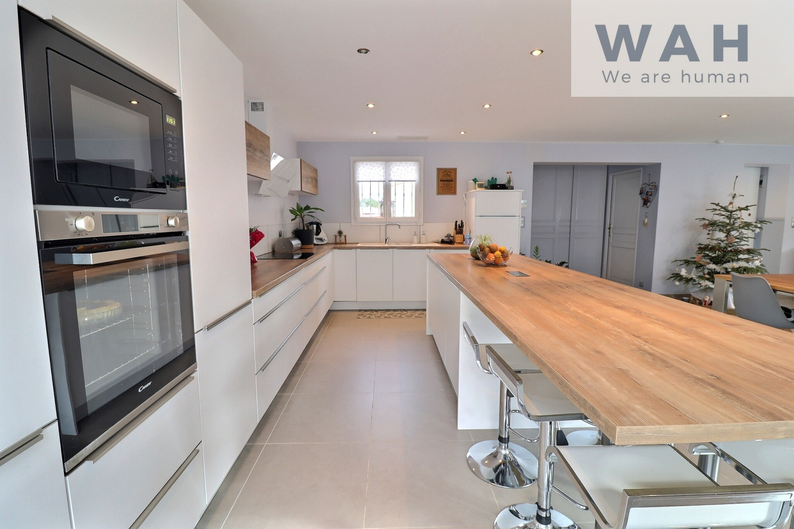 Cette maison d'une surface totale de 192 m² est composée d'une entrée avec placards, une belle cuisine entièrement équipée ouverte sur un grand séjour lumineux, un grand cellier et un wc.