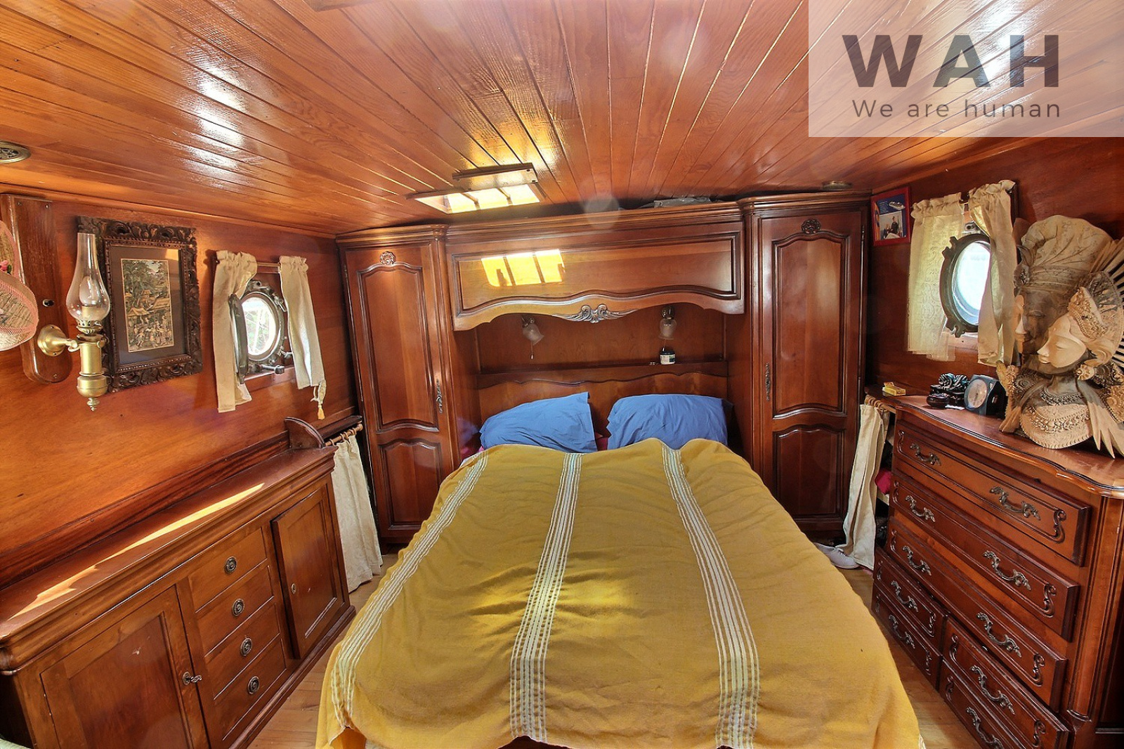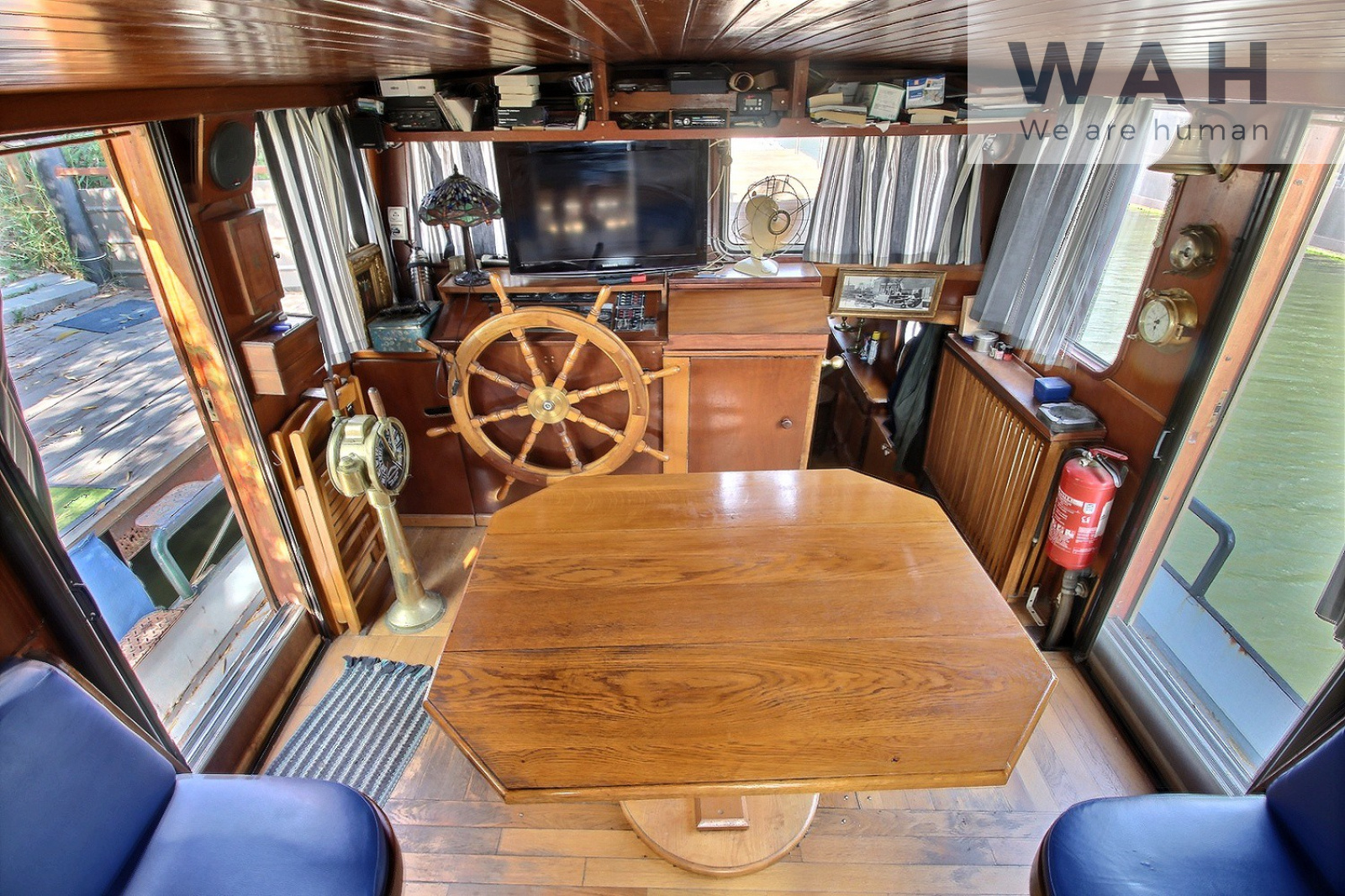 La péniche est composée d'un carré timonerie avec une table 8 personnes et poste de pilotage, d'une autre timonerie abritant une cuisine équipée avec de nombreux rangements, d'une chambre avec lit central, commodes latérales et 2 bureaux, d'une salle d'eau et d'un WC séparé.