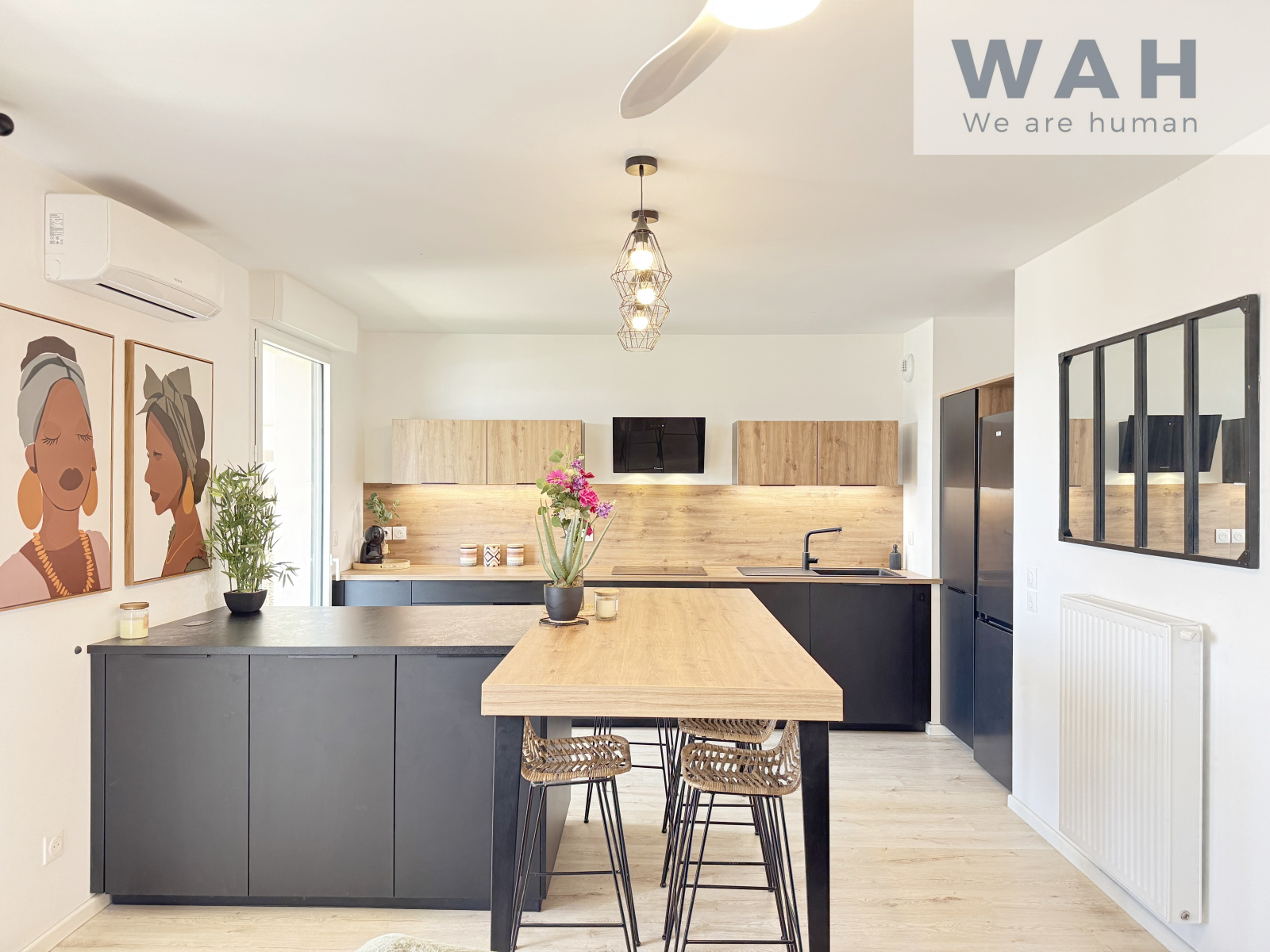 Vous découvrirez un salon/séjour ouvert sur une cuisine moderne entièrement équipée.