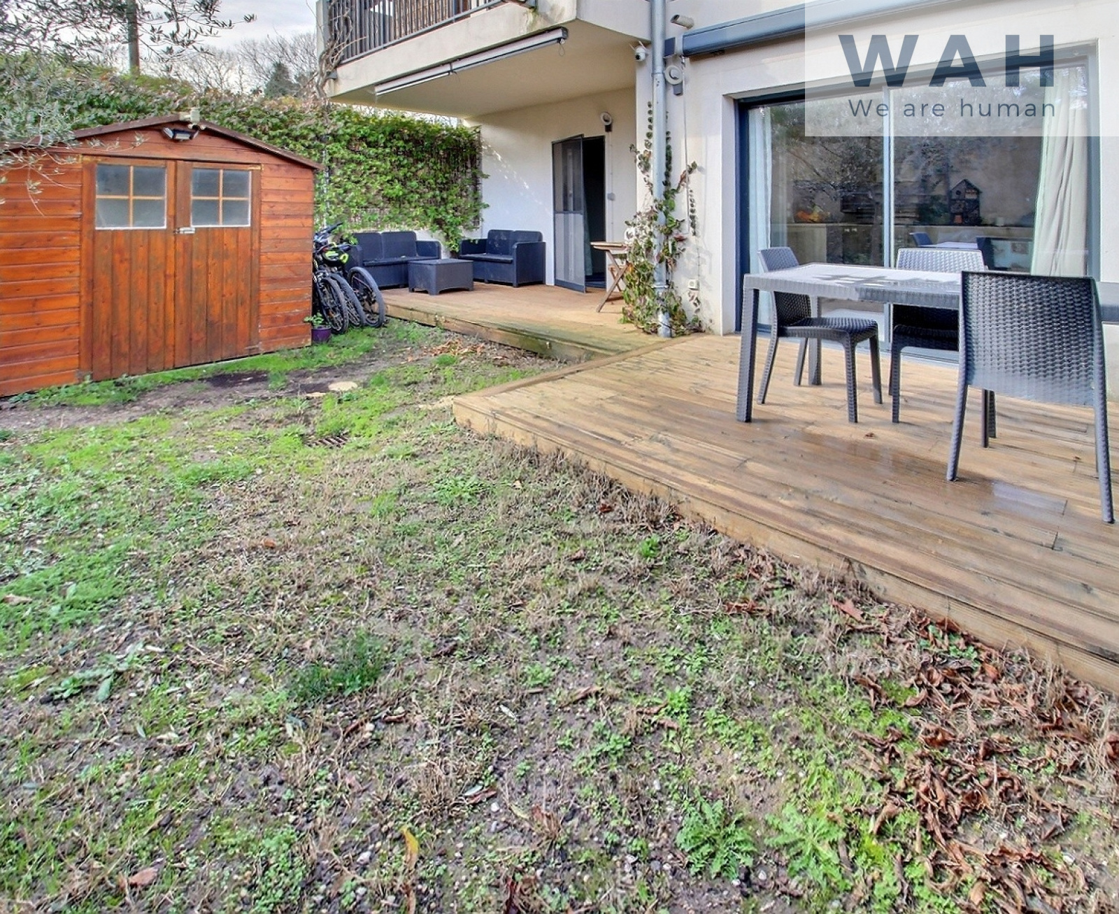 Vous apprécierez son jardin exposé Sud, entièrement clôturé et arboré de 56m² avec sa double terrasse en bois et son chalet de rangements.