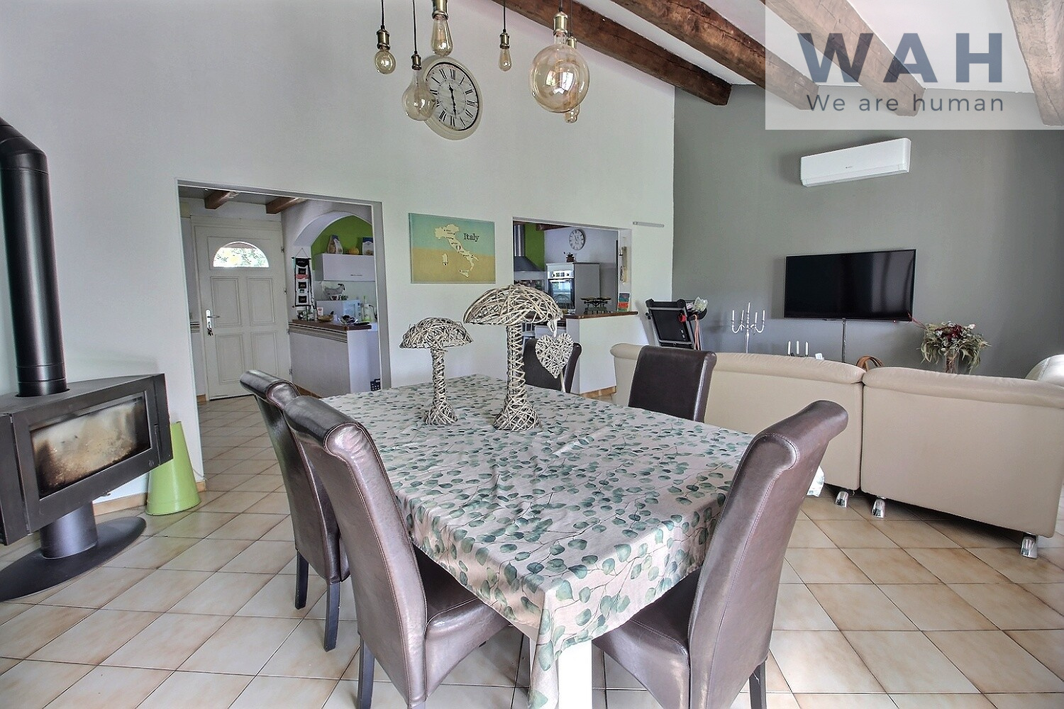 La maison est équipée de la climatisation réversible, d'un poêle à bois et de panneaux photovoltaïques.