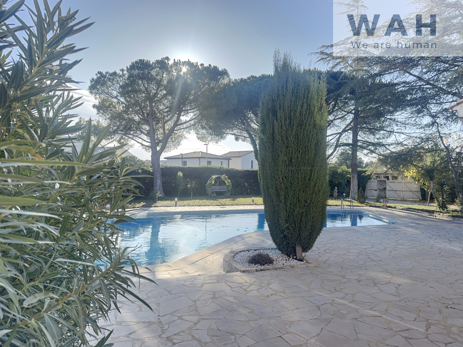 Le parc arboré accueille une piscine accompagnée d’un pool house équipé d’un système automatisé d’entretien.
